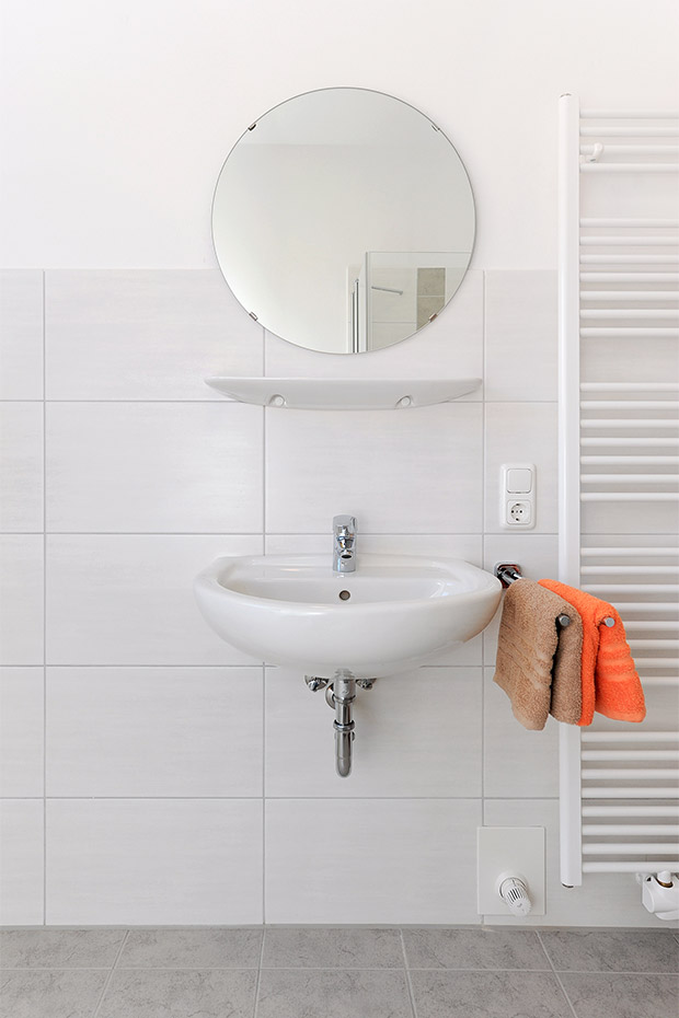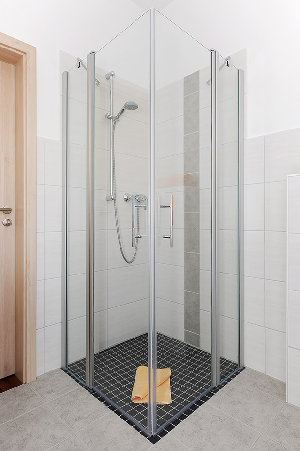 - Badezimmer mit Dusche, Waschtisch und WC