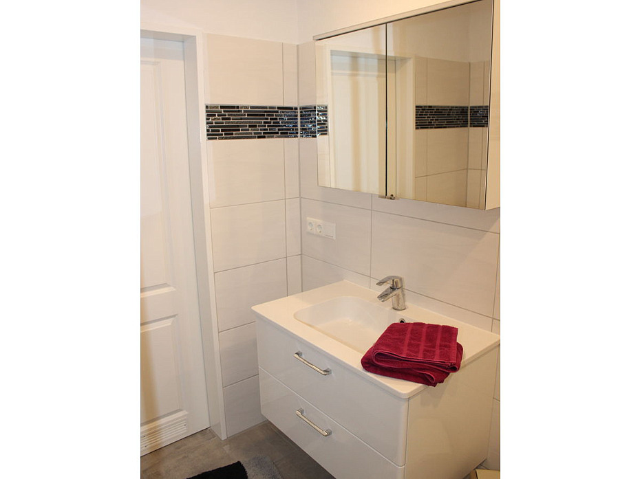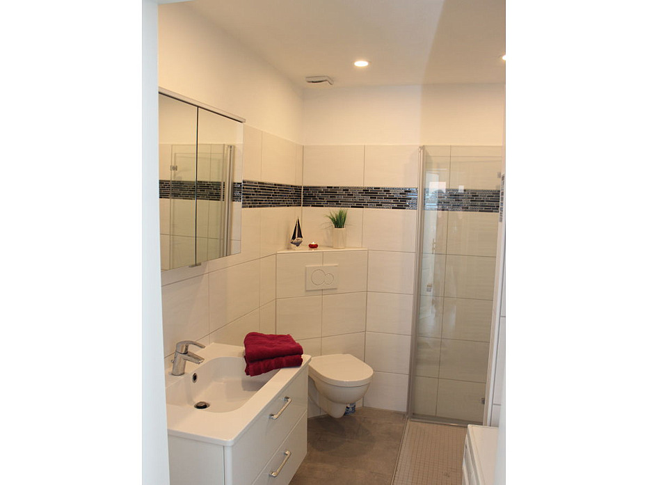 - Badezimmer mit Dusche, Waschtisch und WC