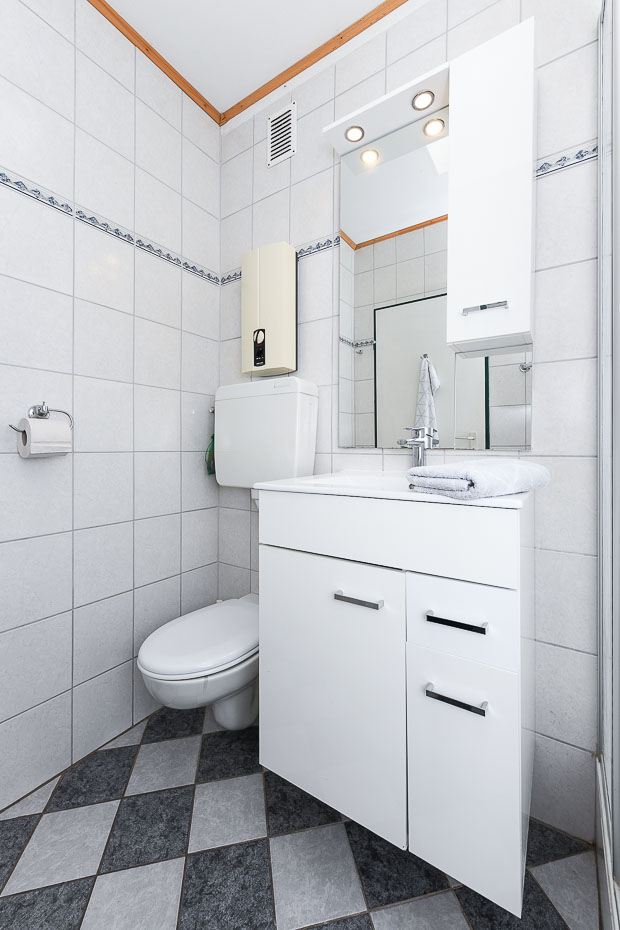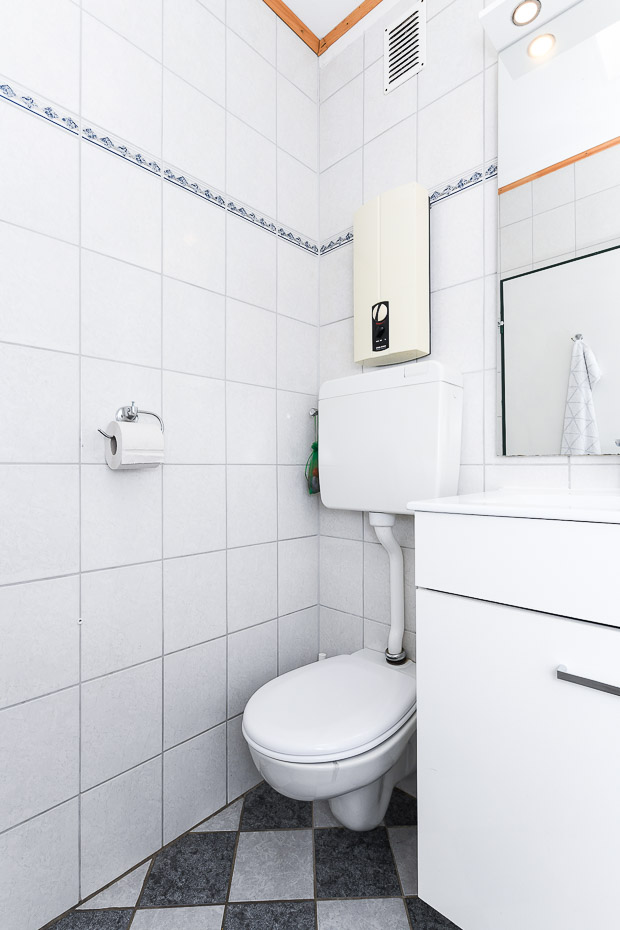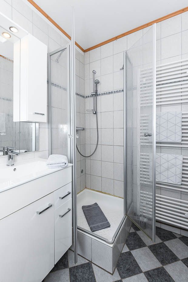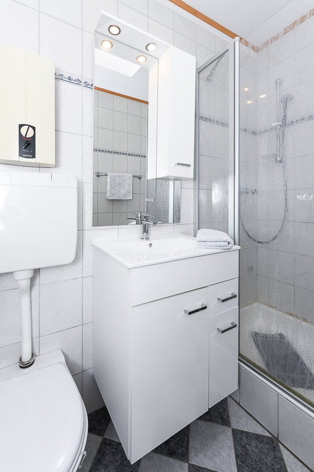 - Badezimmer mit Dusche, Waschtisch und WC
