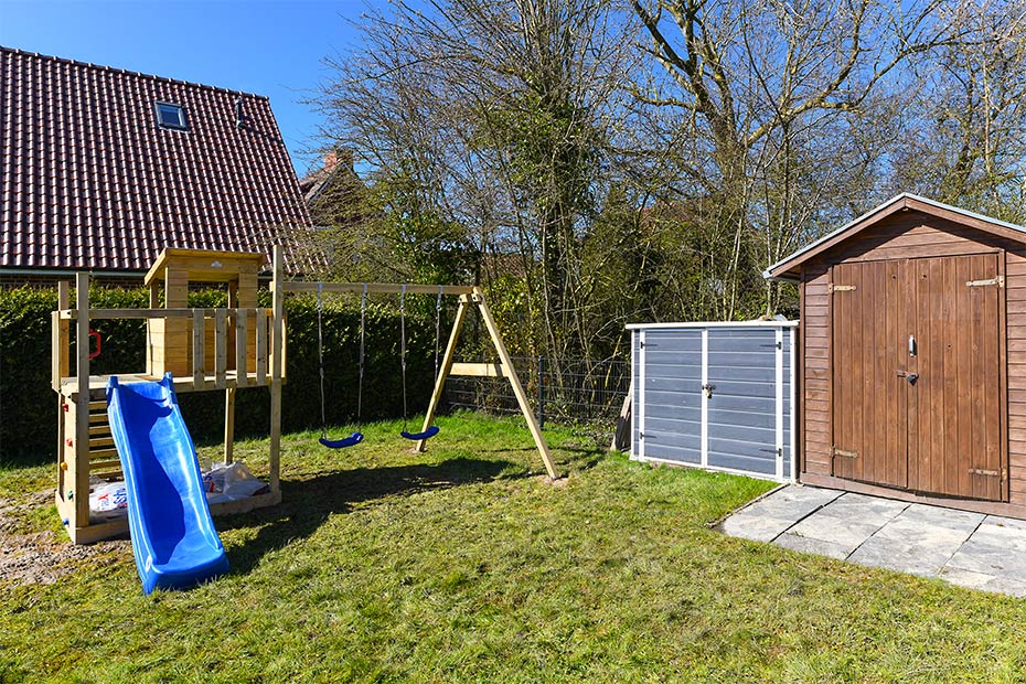 - Garten mit Spielturm mit Sandkasten und Sandspielzeug