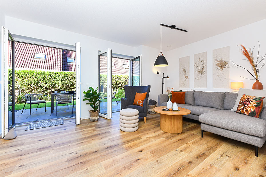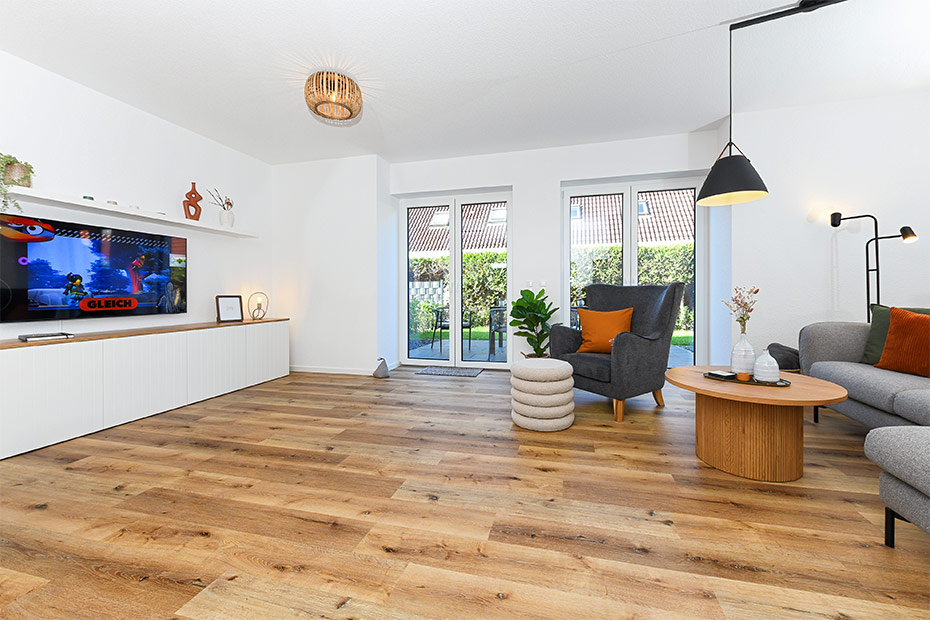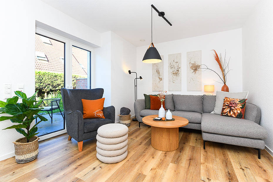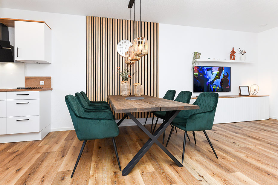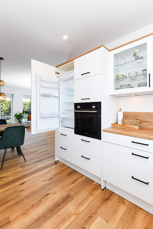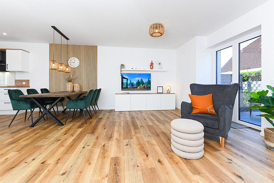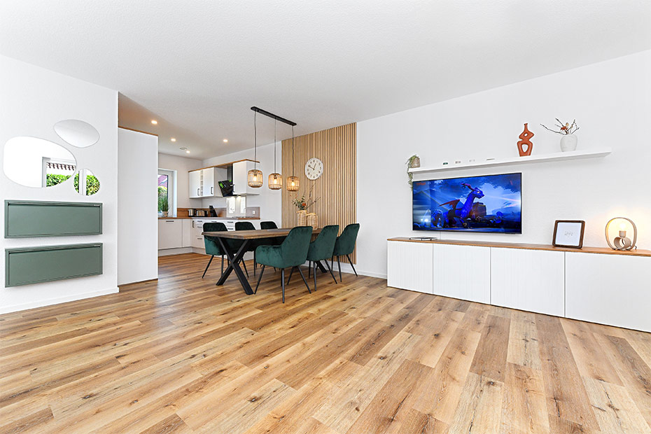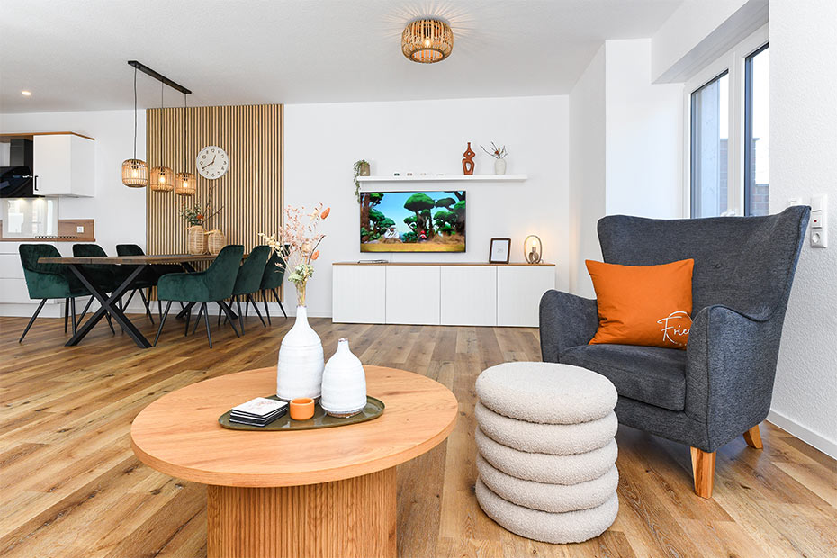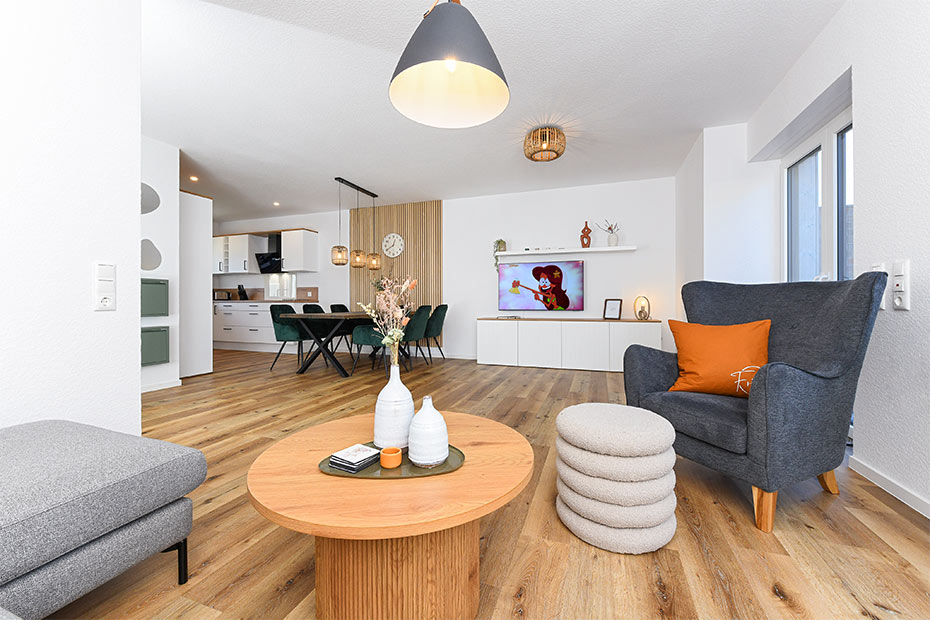 - Wohnraum mit separatem Küchenteil bei offener Raumgestaltung