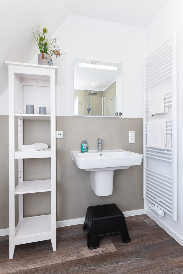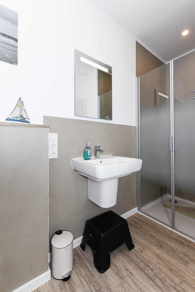 - Badezimmer mit Dusche, Waschtisch und WC