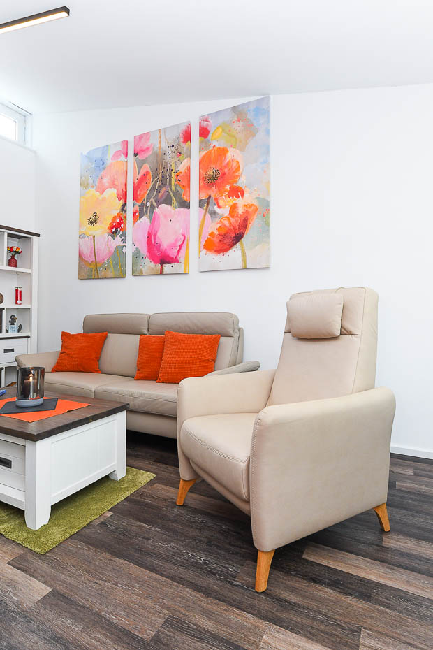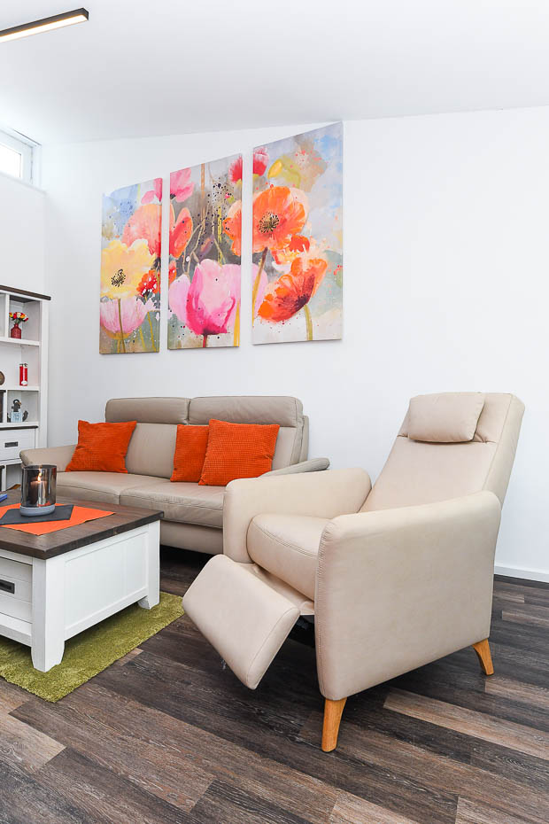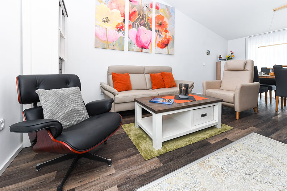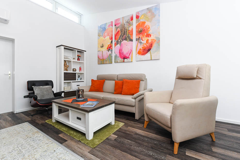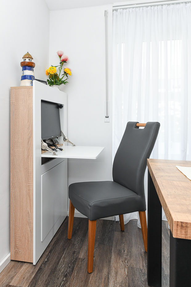 - Couch (2,5-Sitzer Ledercouch, Fernsehsessel, Ledersessel) und ausklappbarer Schreibtisch vorhanden