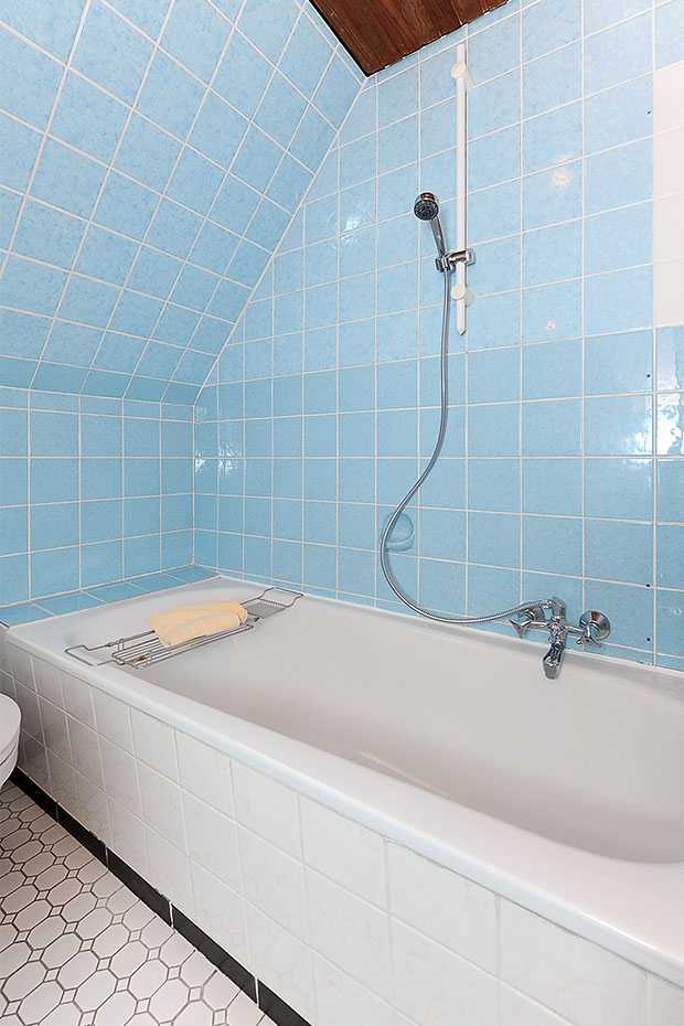 - Badezimmer mit Badewanne (mit fester Duschkabine), Waschtisch und WC