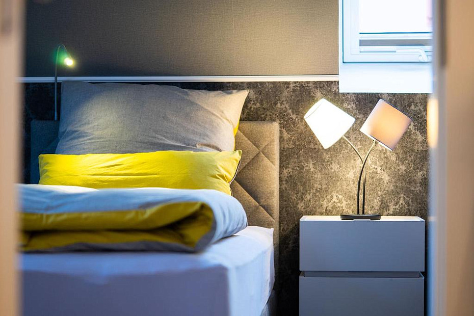 - Verdunkelung: Verdunklungsrollos in den Schlafräumen