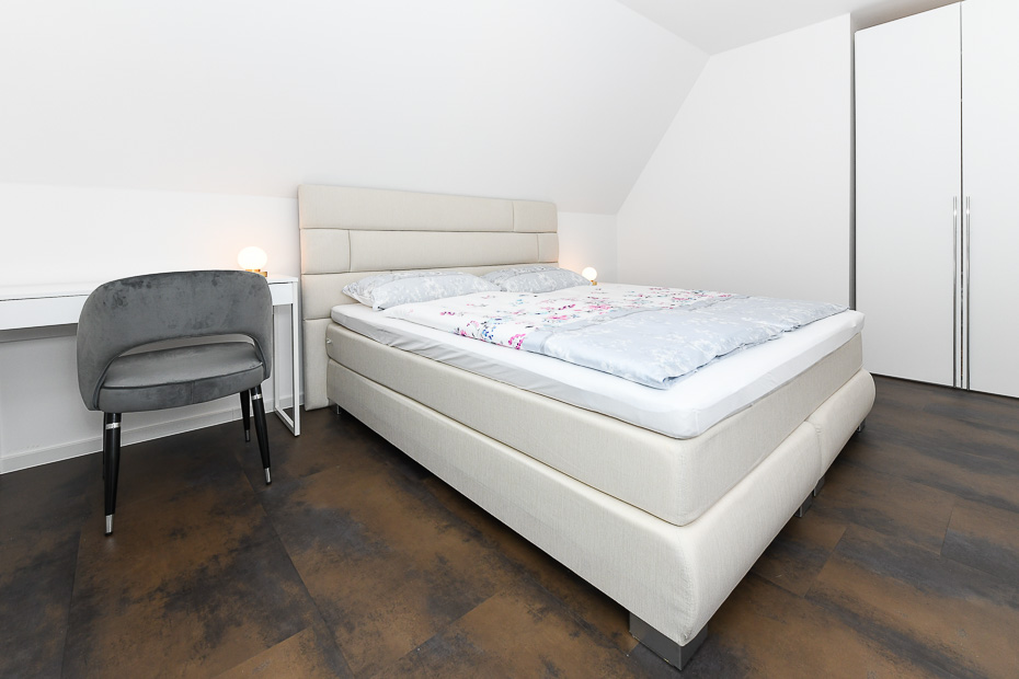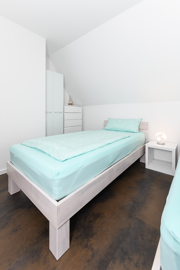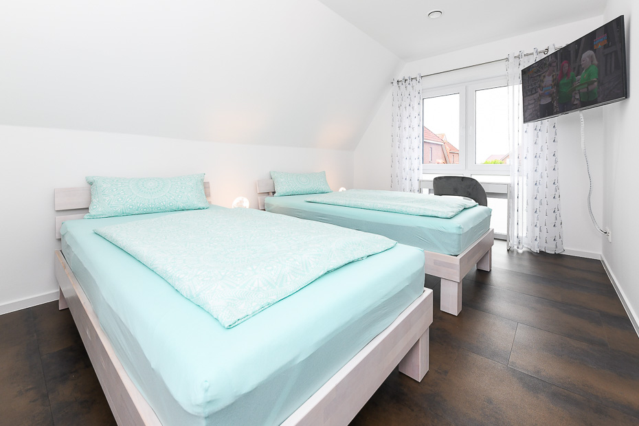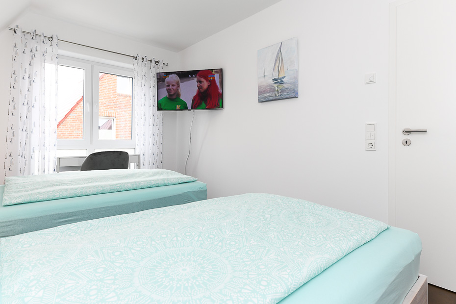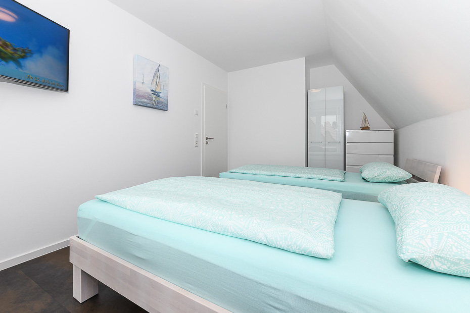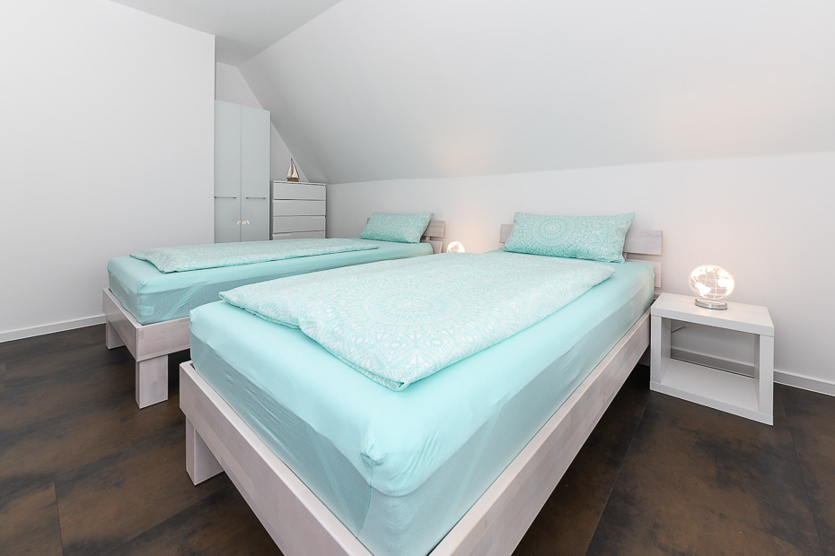 Im Wohnzimmer ist für einen fünften Gast eine Ausklapp-Schlafcouch vorhanden. Es gibt also zwei Schlafzimmer, eines mit einem Doppelbett und eines mit zwei einzelnen auch für Erwachsene geeigneten Betten sowie die Ausklapp-Schlafcouch im Wohnraum.
