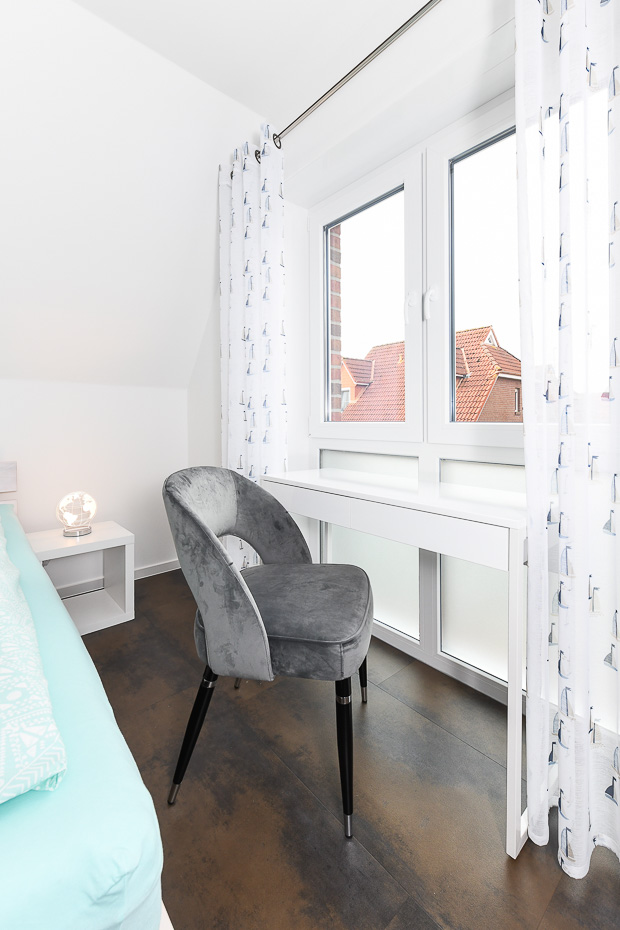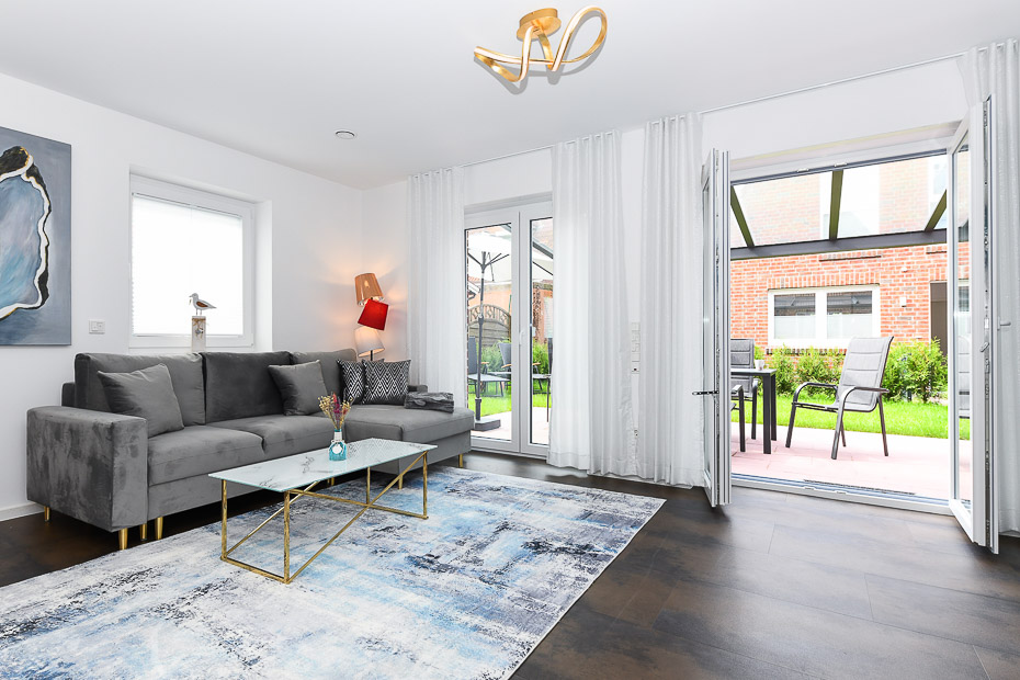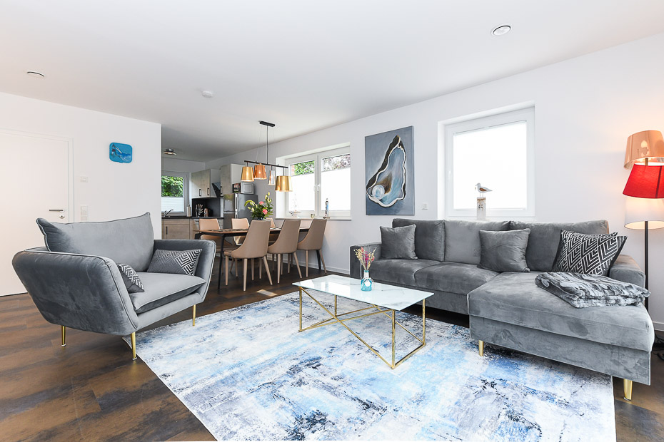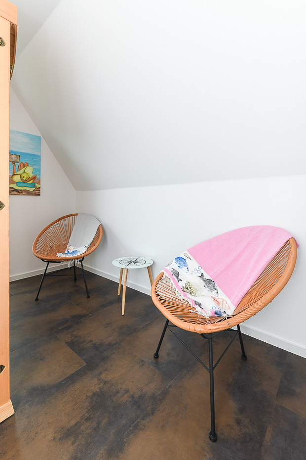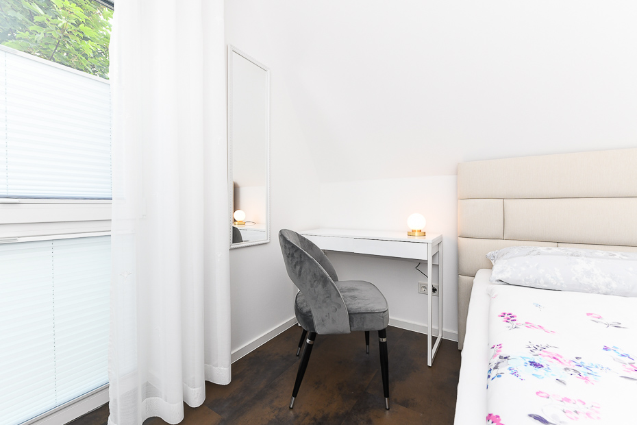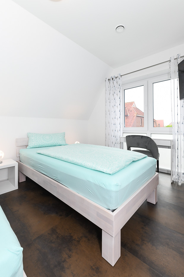 Im Wohnzimmer ist für einen fünften Gast eine Ausklapp-Schlafcouch vorhanden. Es gibt also zwei Schlafzimmer, eines mit einem Doppelbett und eines mit zwei einzelnen auch für Erwachsene geeigneten Betten sowie die Ausklapp-Schlafcouch im Wohnraum.