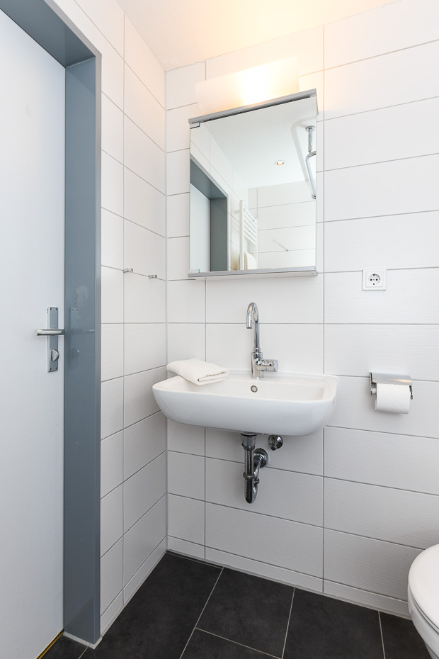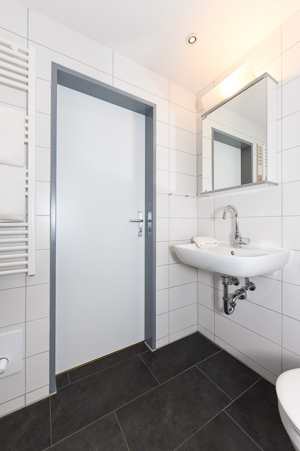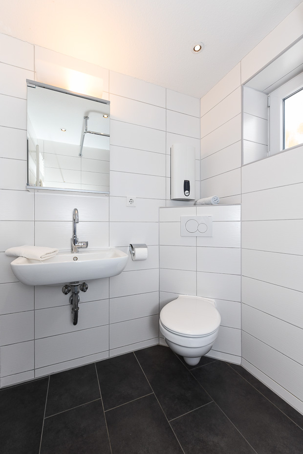 - Badezimmer mit Dusche, Waschtisch und WC