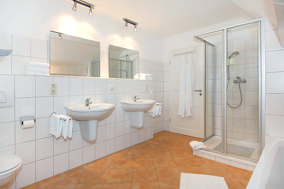 - Badezimmer mit Doppel-Waschbecken, Dusche, Badewanne und WC