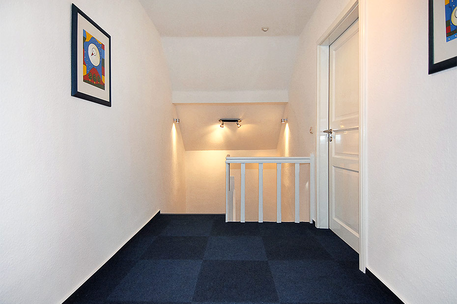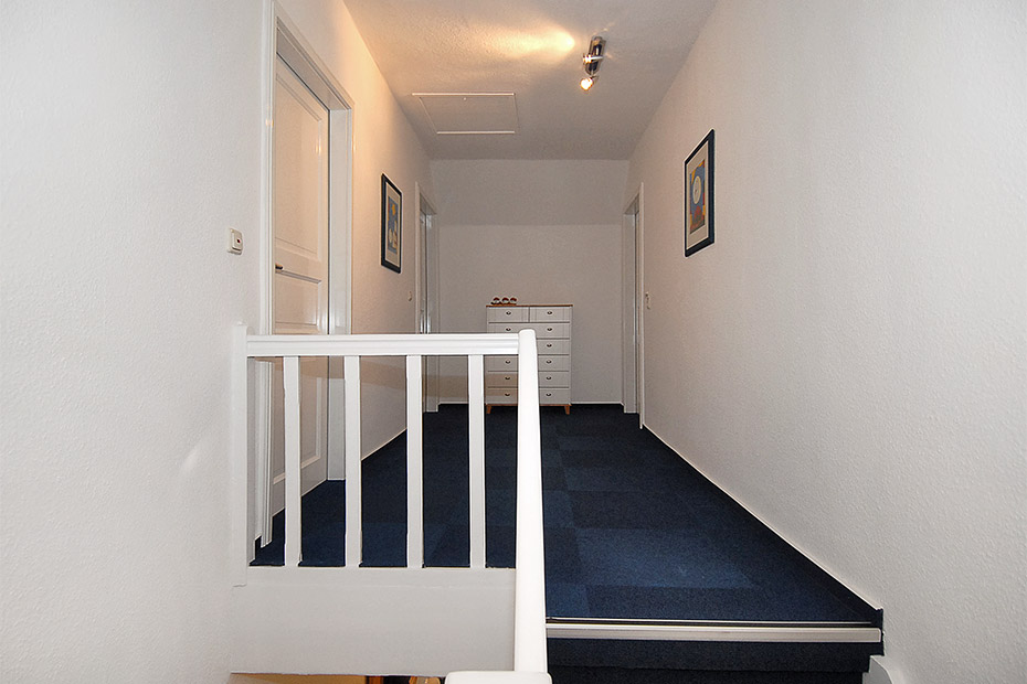 Die Treppe im hinteren Bereich des Hauses führt sechs Stufen abwärts (wie auch im Grundriss angedeutet). Das Haus liegt an einem ehemaligen Stadtwall und so liegen das zweite separate WC (wir nennen es auch „Garten-WC“), der Hauswirtschaftsraum mit Waschmaschine und Wäschetrockner, der große Abstellraum (mit dem großen Gefrierschrank), der hintere Flur sowie die Garage ein Stück tiefer als der Vordereingang.