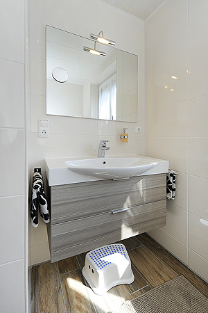 - Badezimmer mit Dusche, Waschtisch und WC