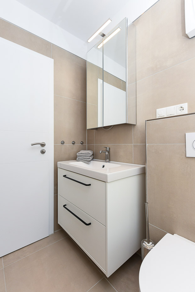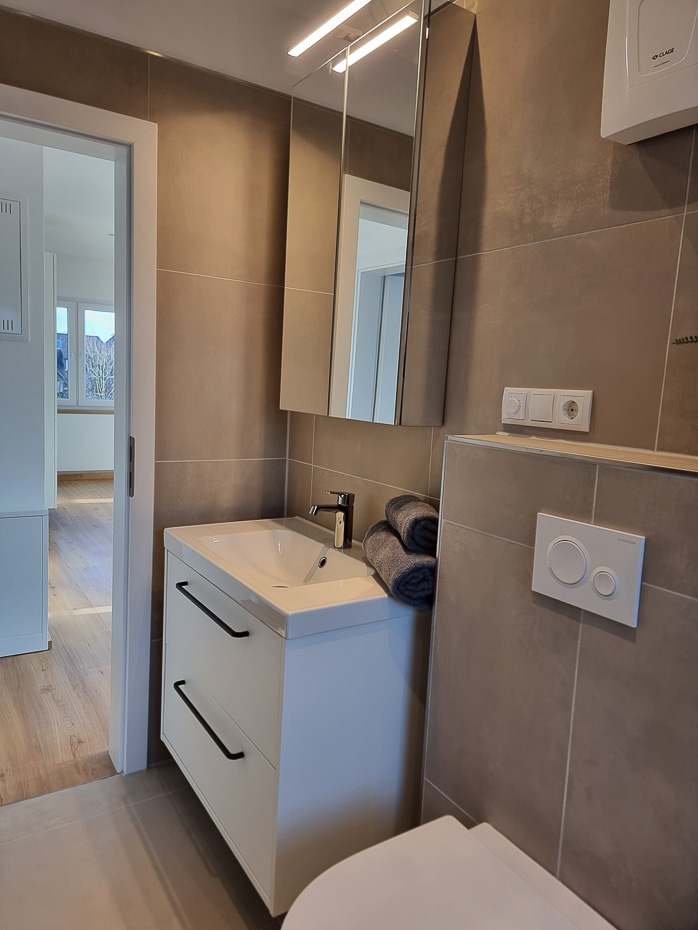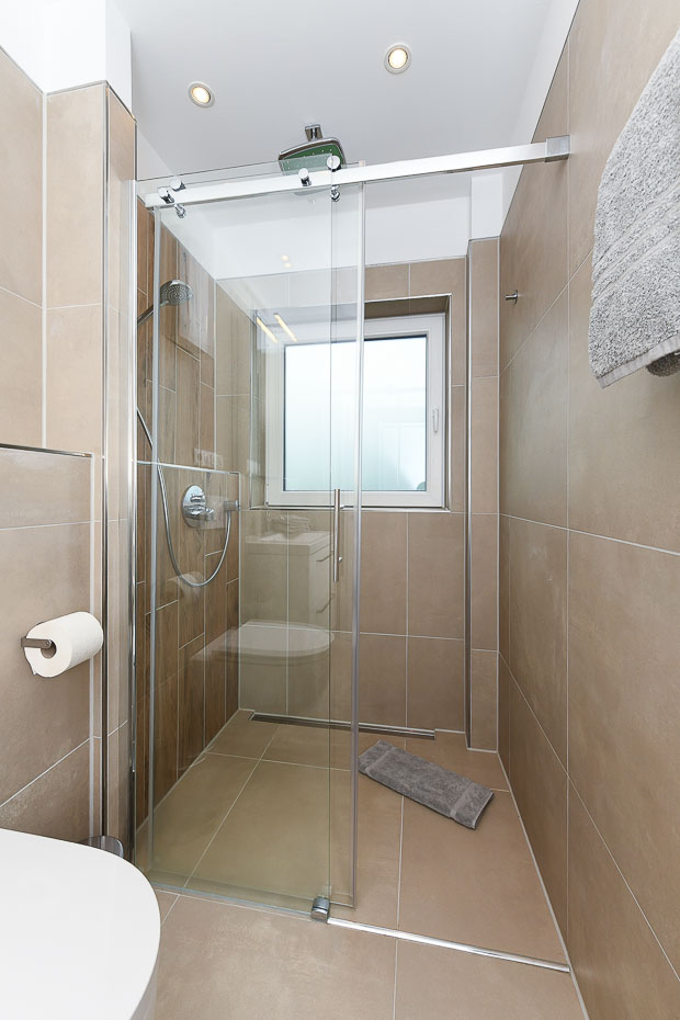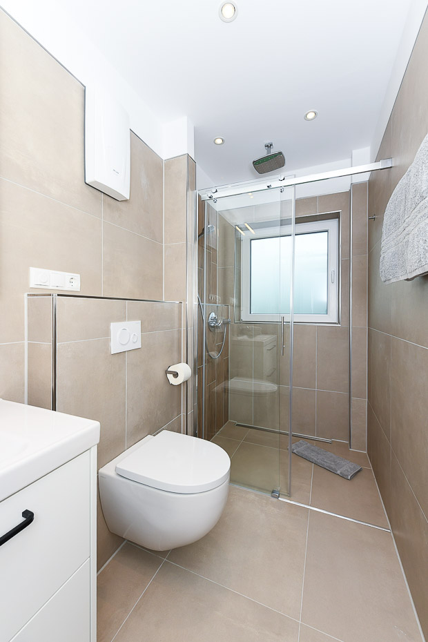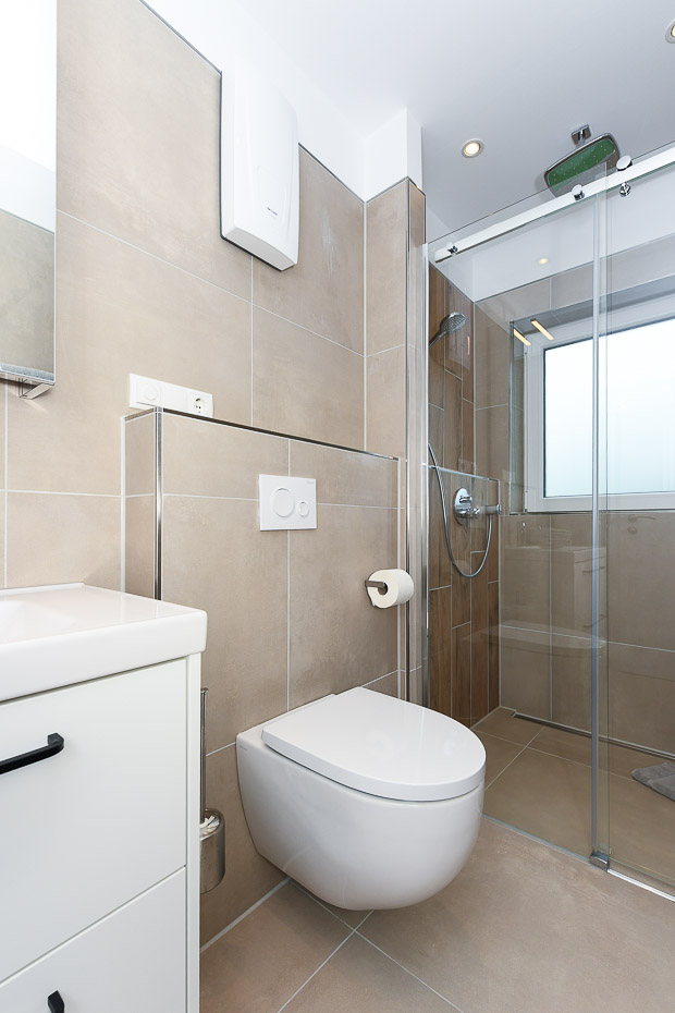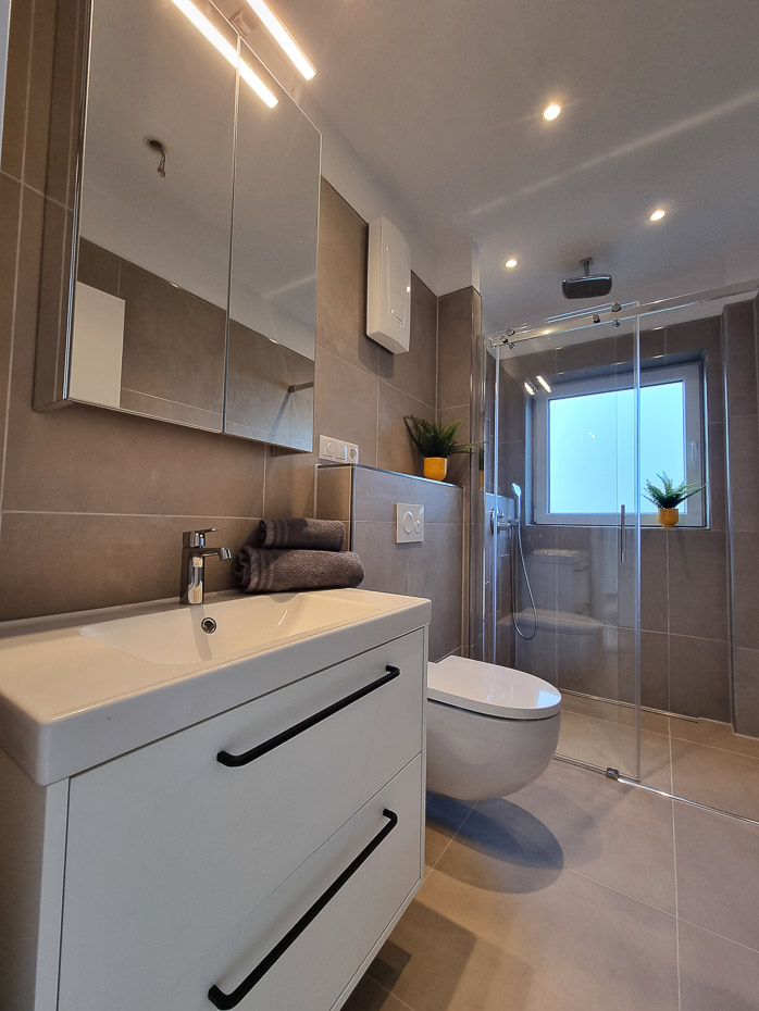 - Badezimmer mit Dusche, Waschtisch, Bidet und WC