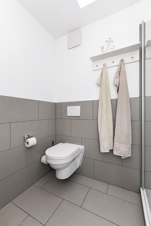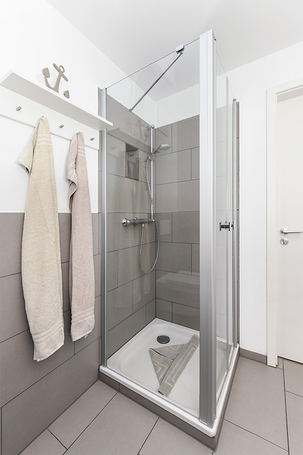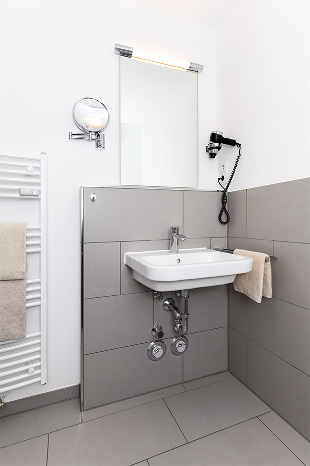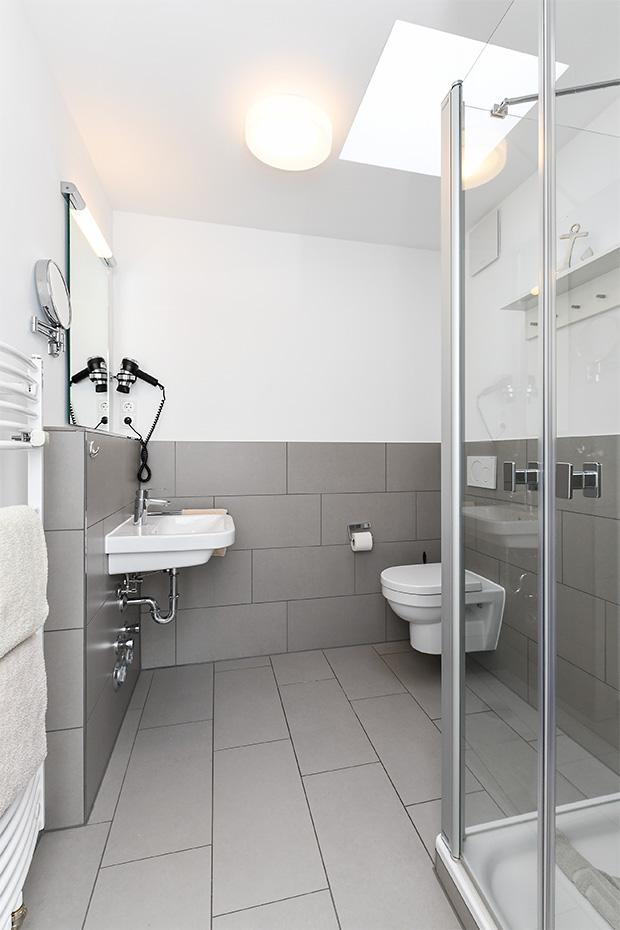 - Badezimmer mit Dusche, Waschtisch und WC