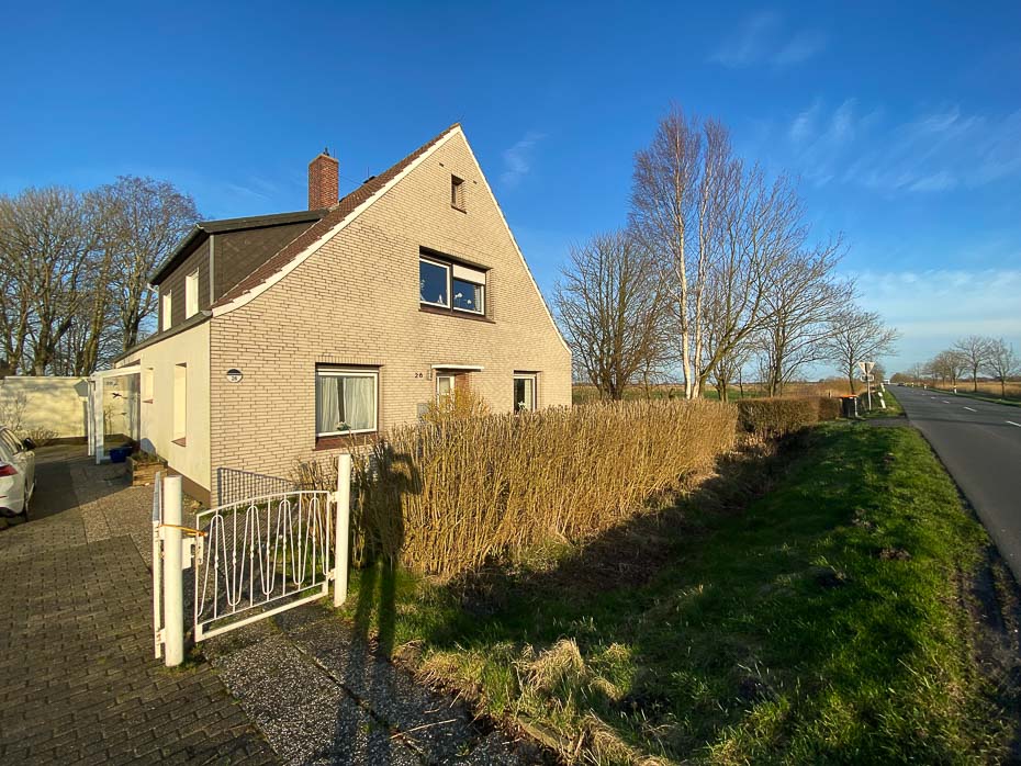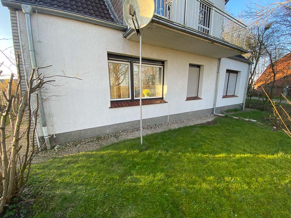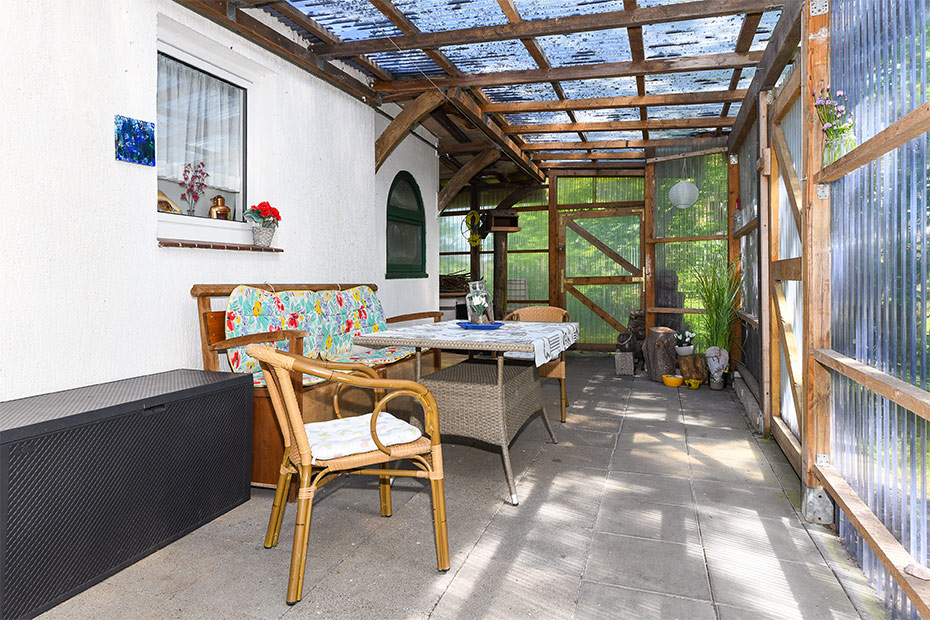 Es gibt eine überdachte Möglichkeit, draußen vor dem Wohnzimmer auf dem Rasen zu sitzen. Der Zugang erfolgt über die Wohnungstür.