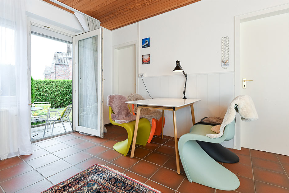 - Terrasse mit kleinem Garten und Gartenmöbeln