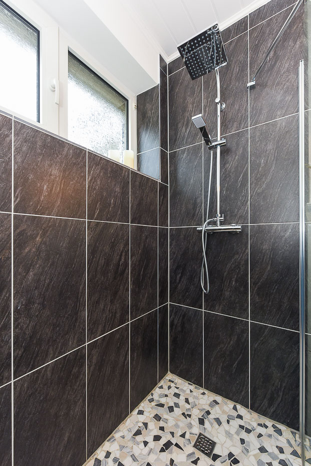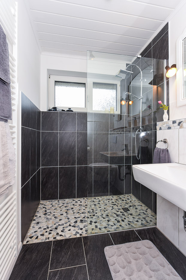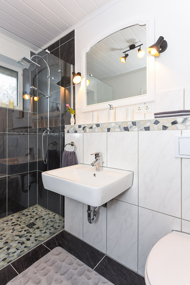 - Badezimmer mit Dusche, Waschtisch und WC
