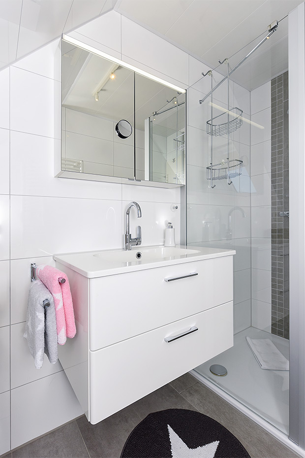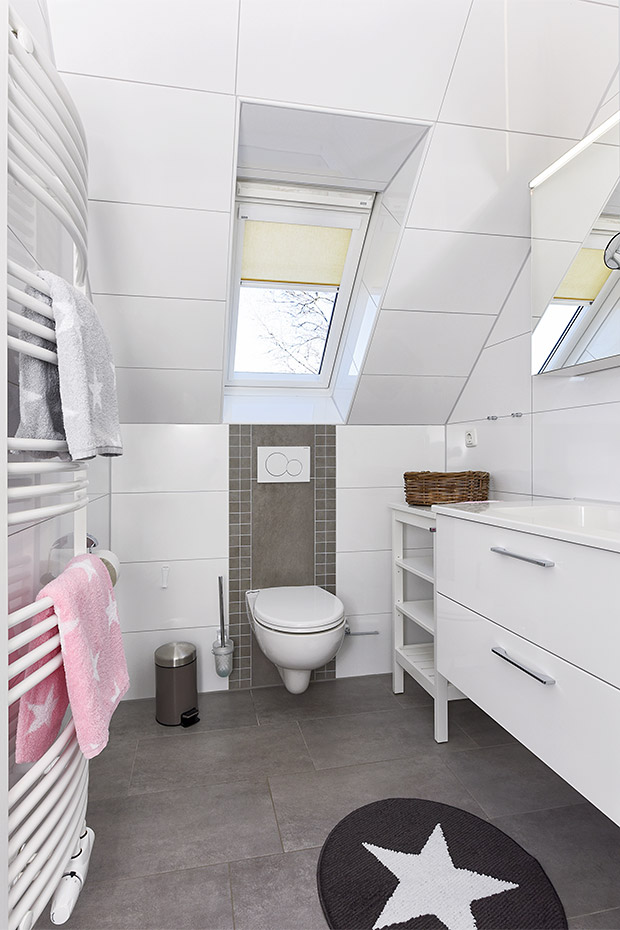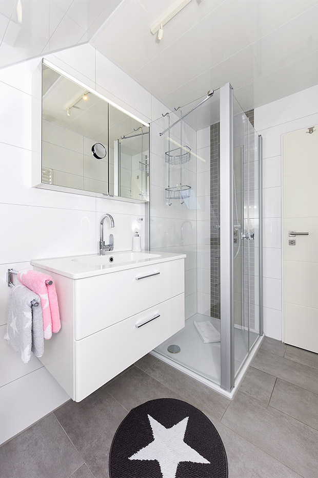 - Badezimmer mit Dusche, Waschtisch und WC