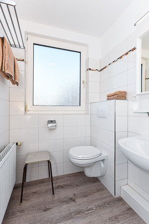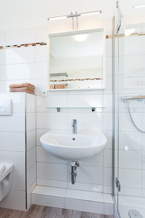 - Badezimmer mit Dusche, Waschtisch und WC