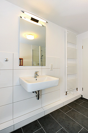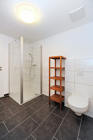 - Badezimmer mit Dusche, Waschtisch und WC