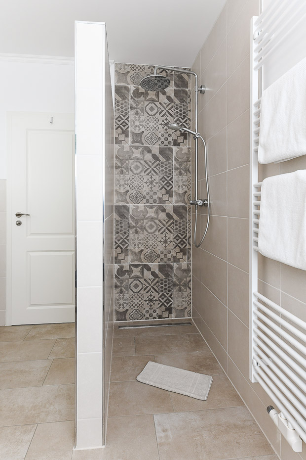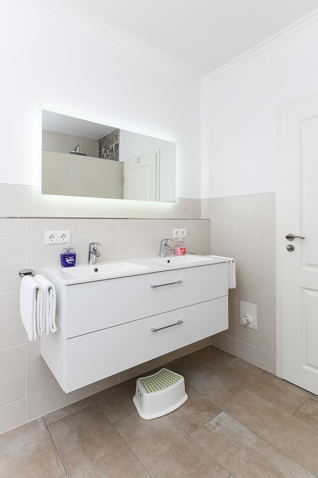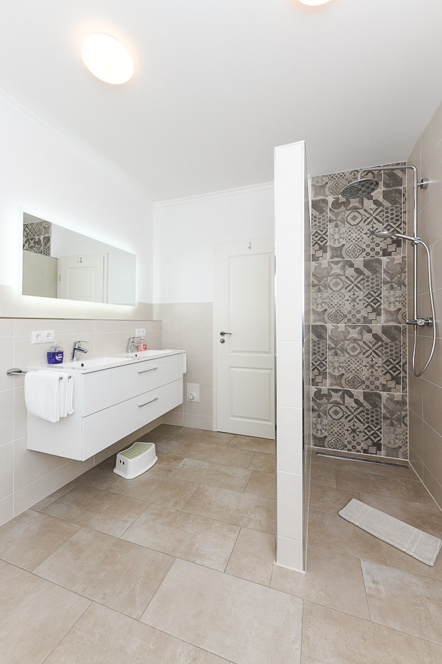 - Badezimmer mit Dusche, 2 Waschtischen und WC