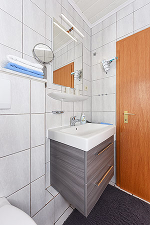 - Badezimmer mit Dusche, Waschtisch und WC