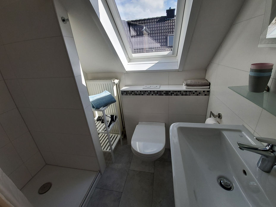 - Badezimmer mit Dusche, Waschtisch und WC