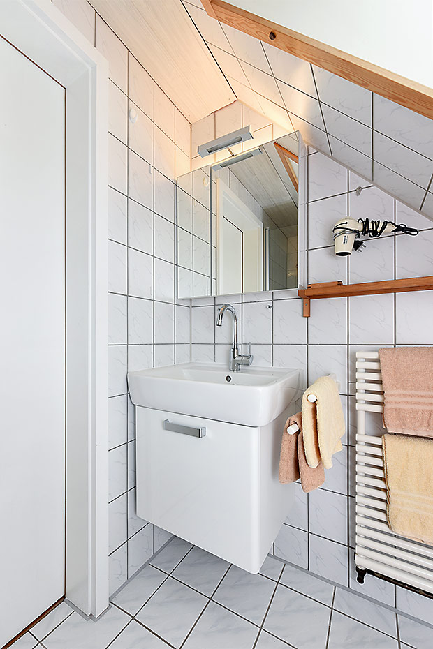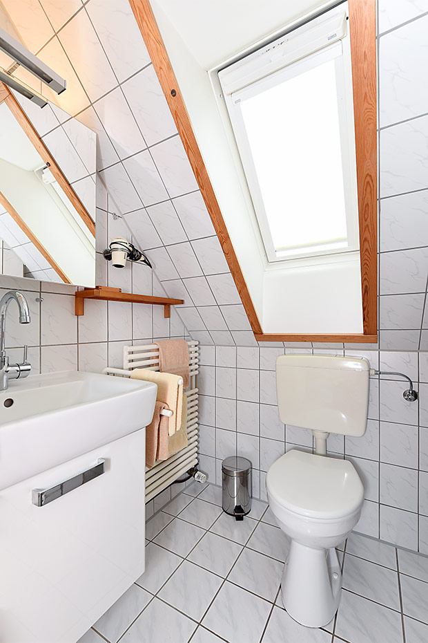 - Badezimmer mit Dusche, Waschtisch und WC