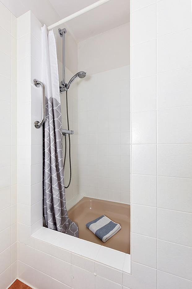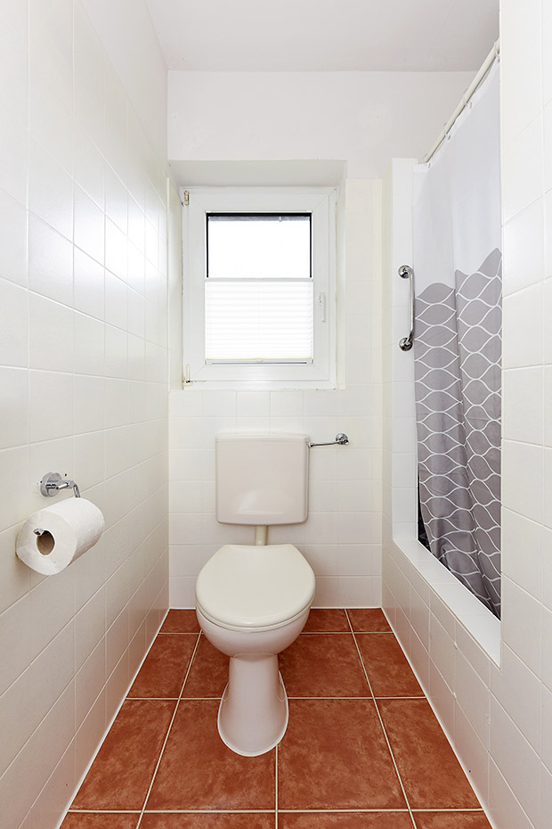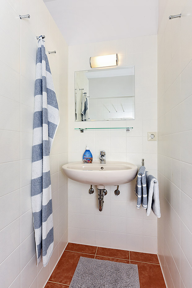 - Badezimmer mit Dusche, Waschtisch und WC