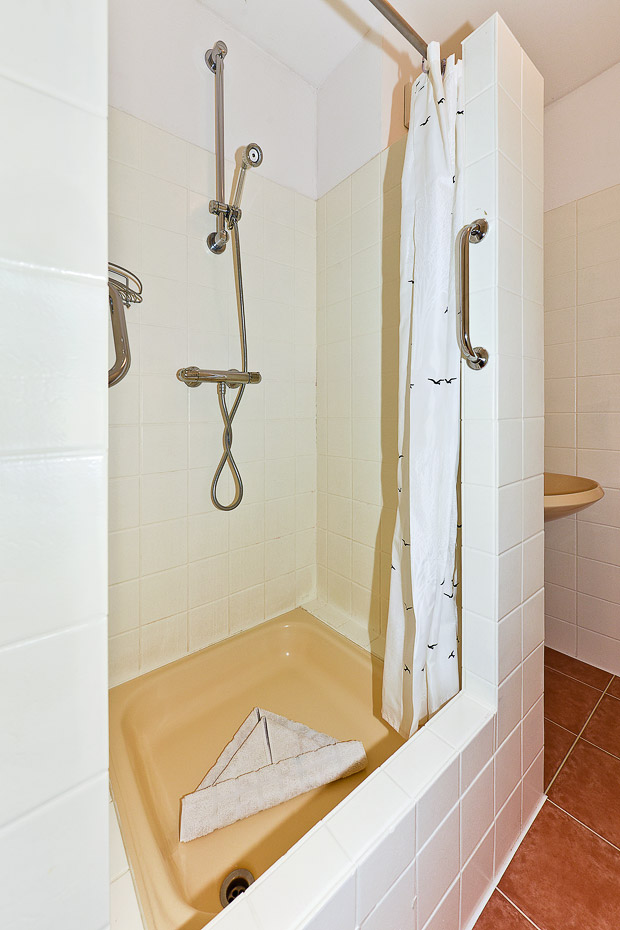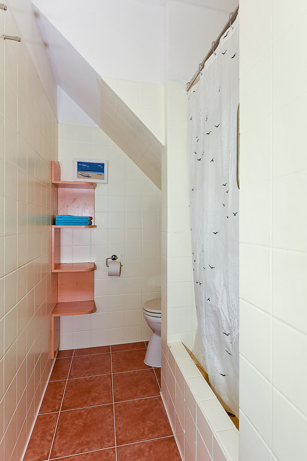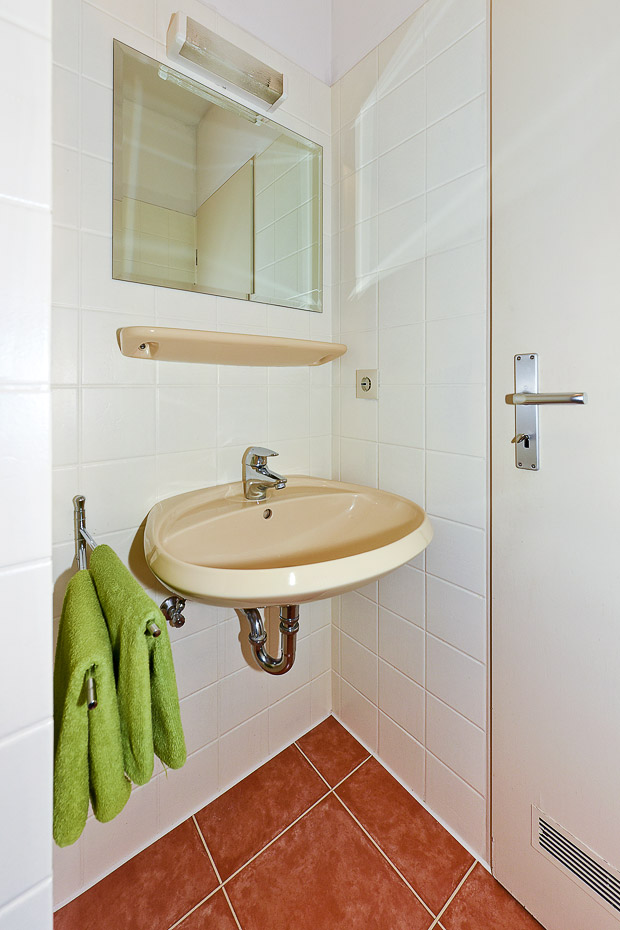 - Badezimmer mit Dusche, Waschtisch und WC