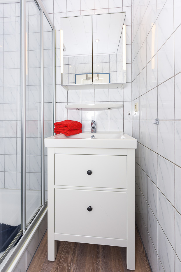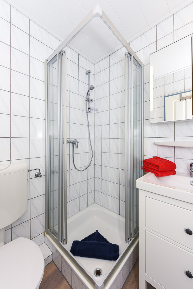 - Badezimmer mit Dusche, Waschtisch und WC