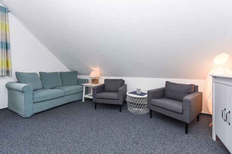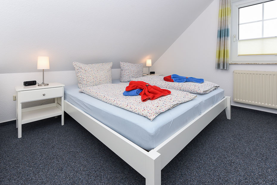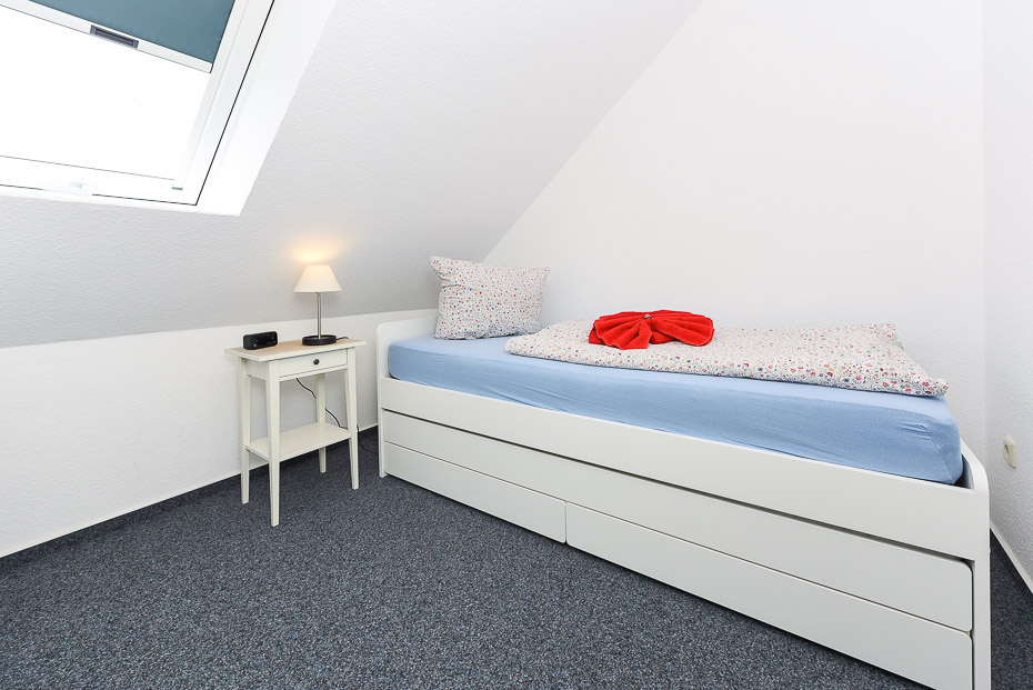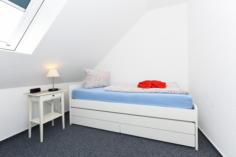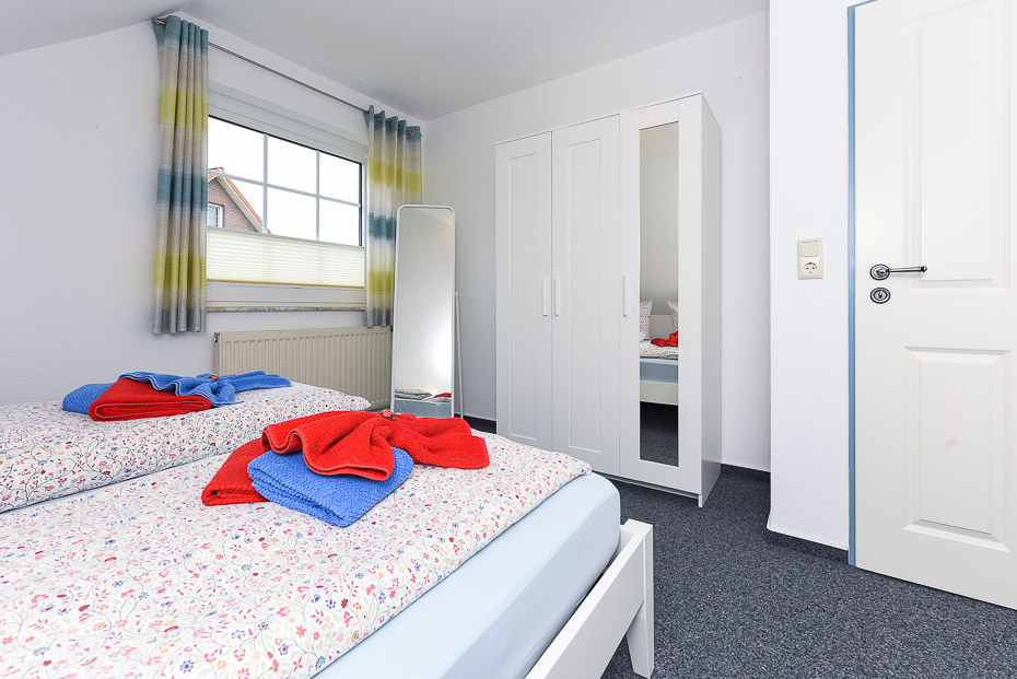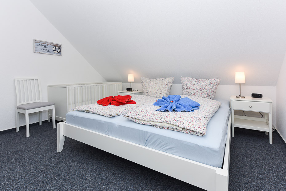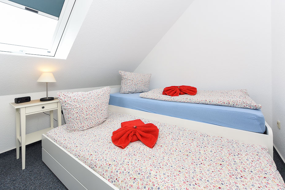 Die Wohnung befindet sich im 1. Obergeschoss. Es sind zwei Schlafräume vorhanden. Die Wohnung ist mit einem Doppelbett im Schlafzimmer und einem im seperatem Raum stehendem Einzelbett mit ausziehbarem Bettkasten mit Liegefläche (je 200 x 90cm) ausgestattet (optimalerweise für Kinder).