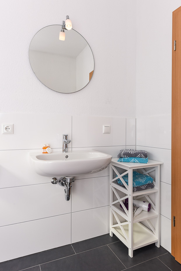 - Badezimmer mit Dusche, Waschtisch und WC