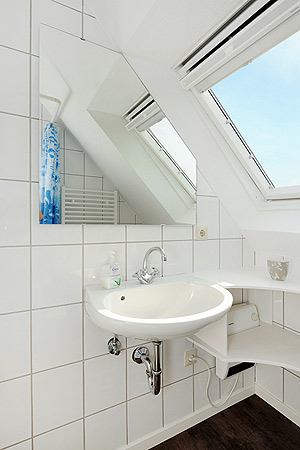 - Badezimmer mit Dusche, Waschtisch und WC
