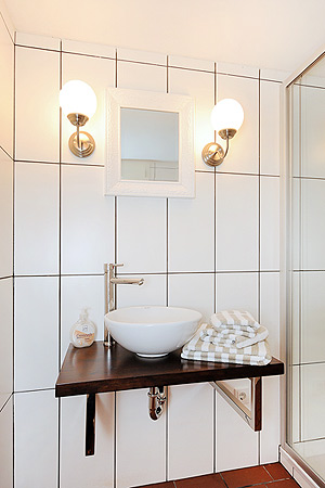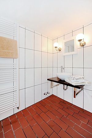 - Badezimmer mit Dusche, Waschtisch und WC