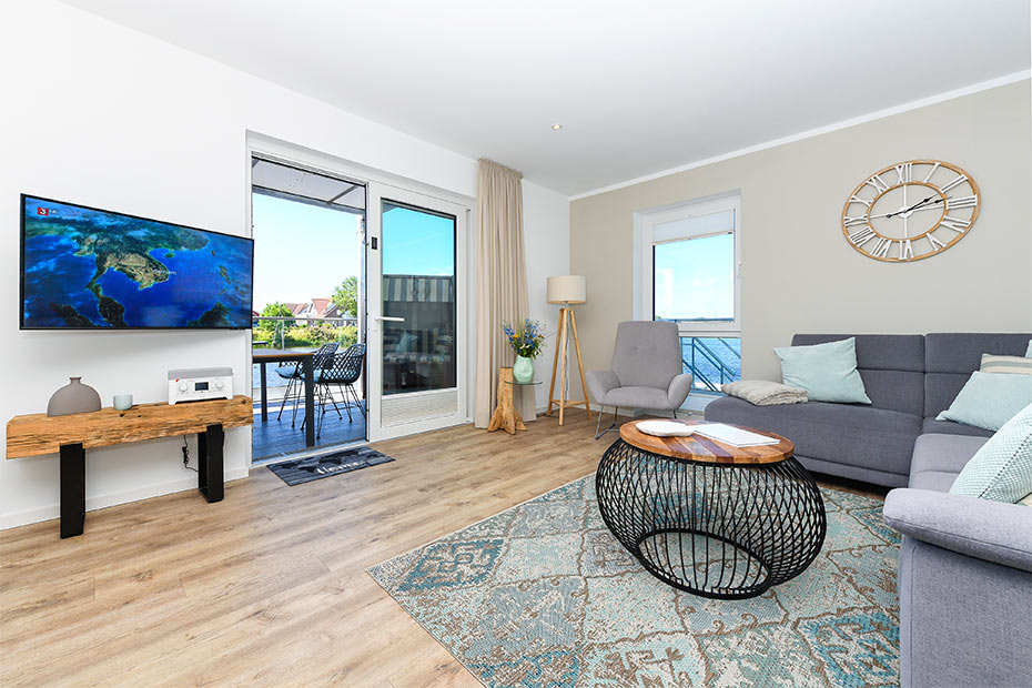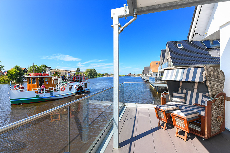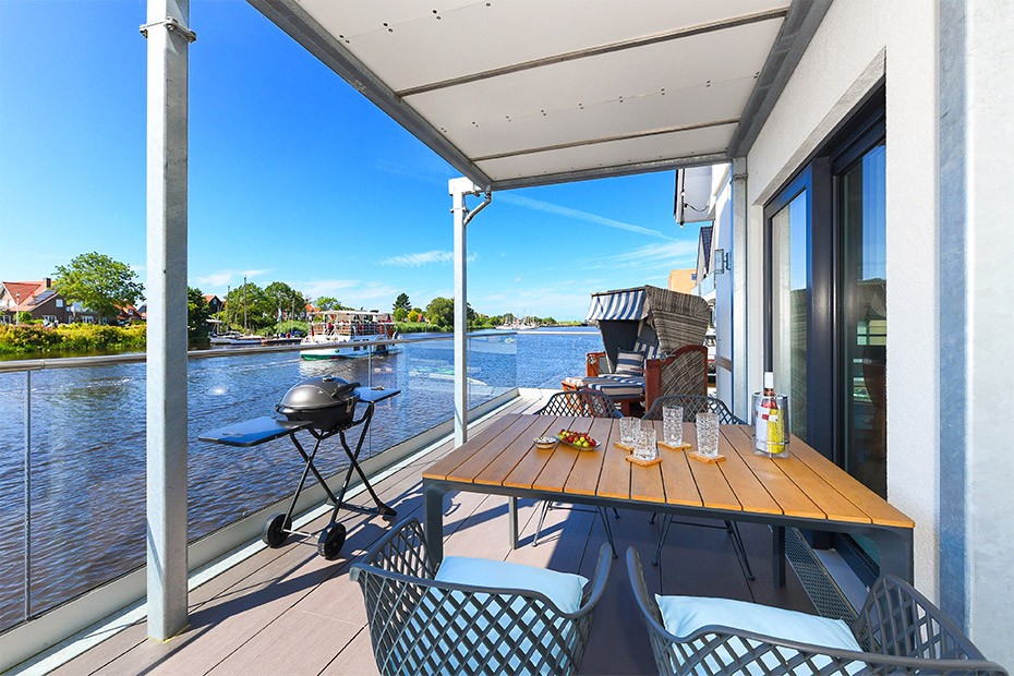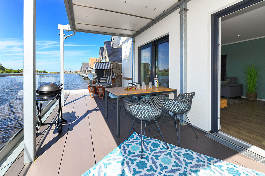 - Terrasse in der Wohnung Ebbe und Balkon in der Wohnung Flut mit Panoramablick und Strandkorb