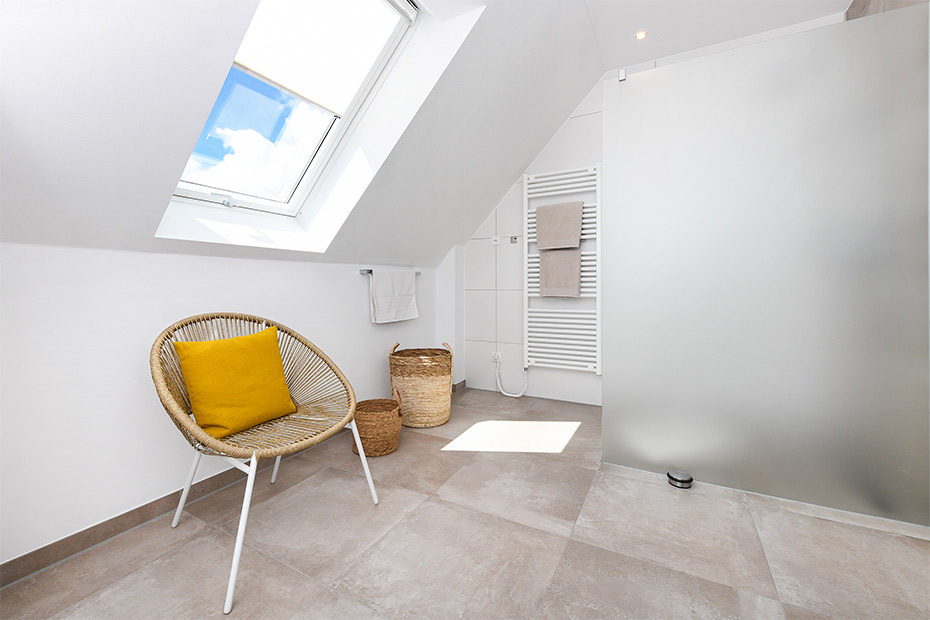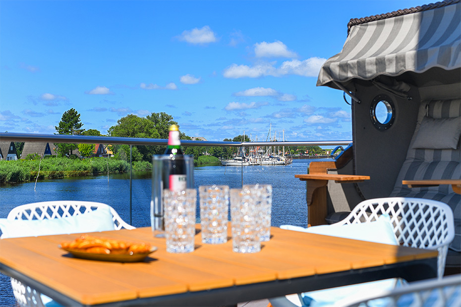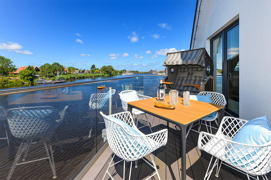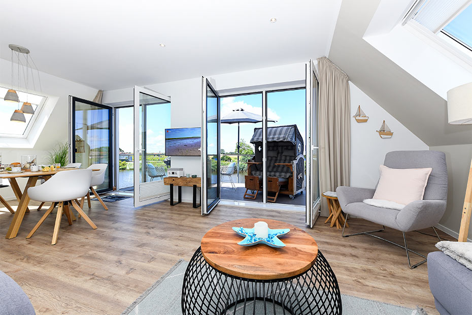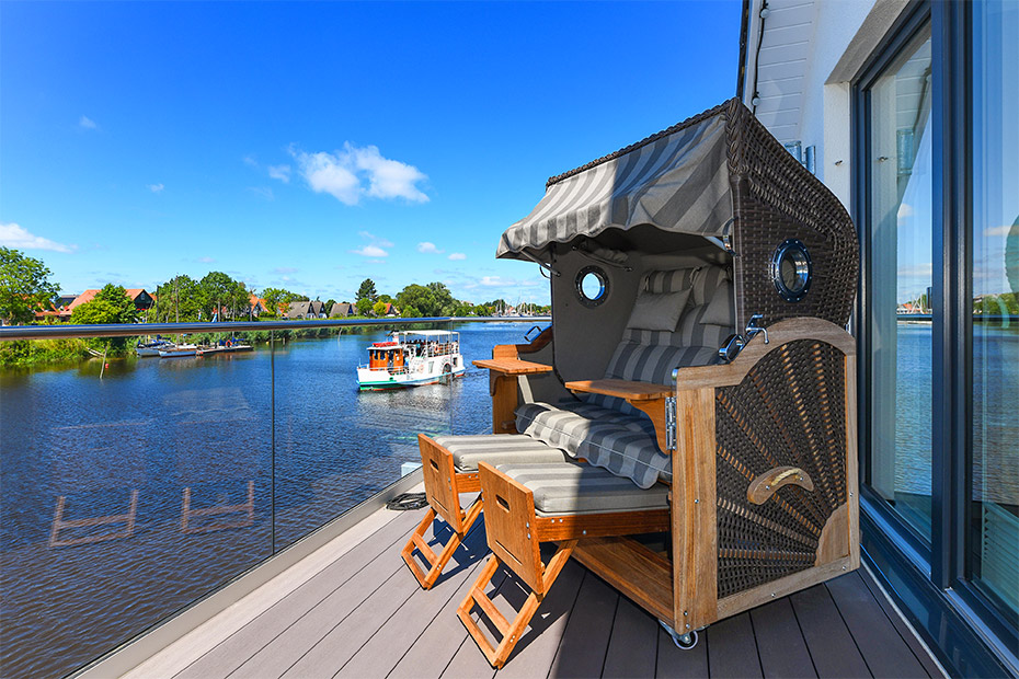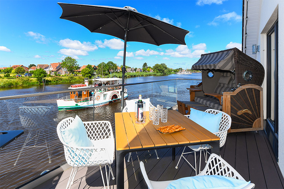 - Terrasse in der Wohnung Ebbe und Balkon in der Wohnung Flut mit Panoramablick und Strandkorb